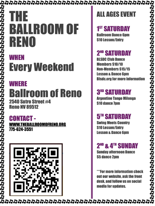 Go to https://www.theballroomofreno.org/group-classes to see more details about all the weekly dances that are happening at the ballroom.