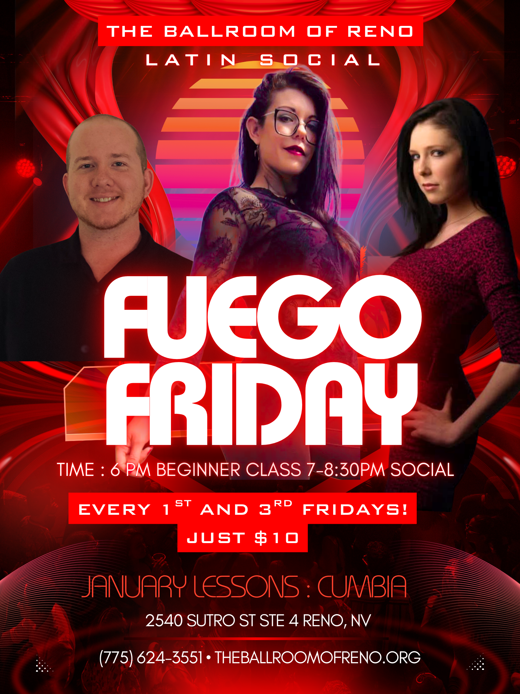 On the 1st & 3rd Friday’s of the month we host: Fuego Friday’s (Aka Latin socials). Come to these Fridays if you practice your Latin dancing. Cost: $10